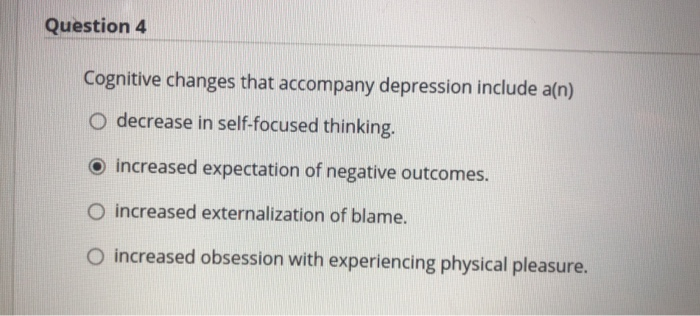 B increased expectation of negative outcomes. O increased externalization of blame. Cognitive changes that accompany depression include an A decrease in self-focused thinking.
